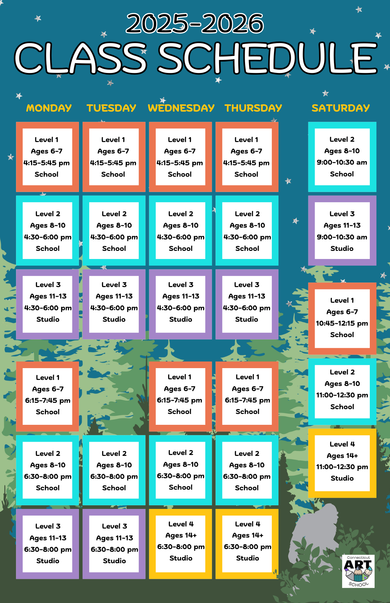 Updated September 11, 2025. Registration for the 2025/2026 school year is now open. Click here to register. If a class is listed as full please email us to be added to a wait list: info@ct-artschool.com. Classes begin on Monday, September 8, 2025.